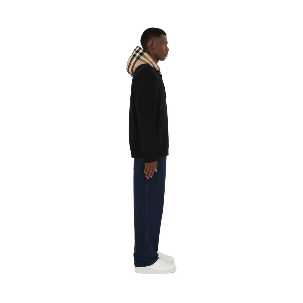A zip hoodie in loop-back cotton jersey with a contrasting hood in Burberry Check cotton flannel. The design is cut to a relaxed fit and has calf leather trims.