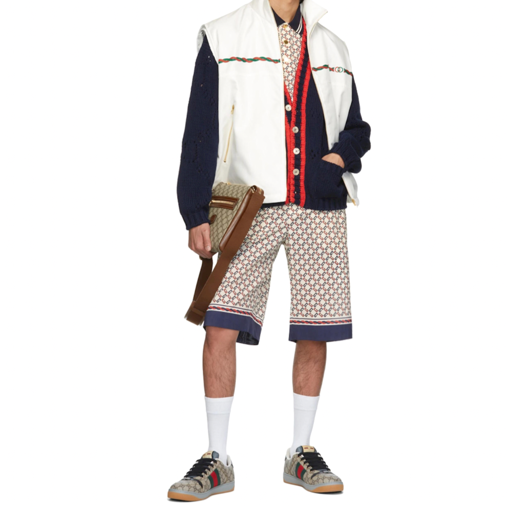 Low-top coated canvas sneakers in beige featuring logo pattern in brown. Signature webbing trim in red and green at sides.