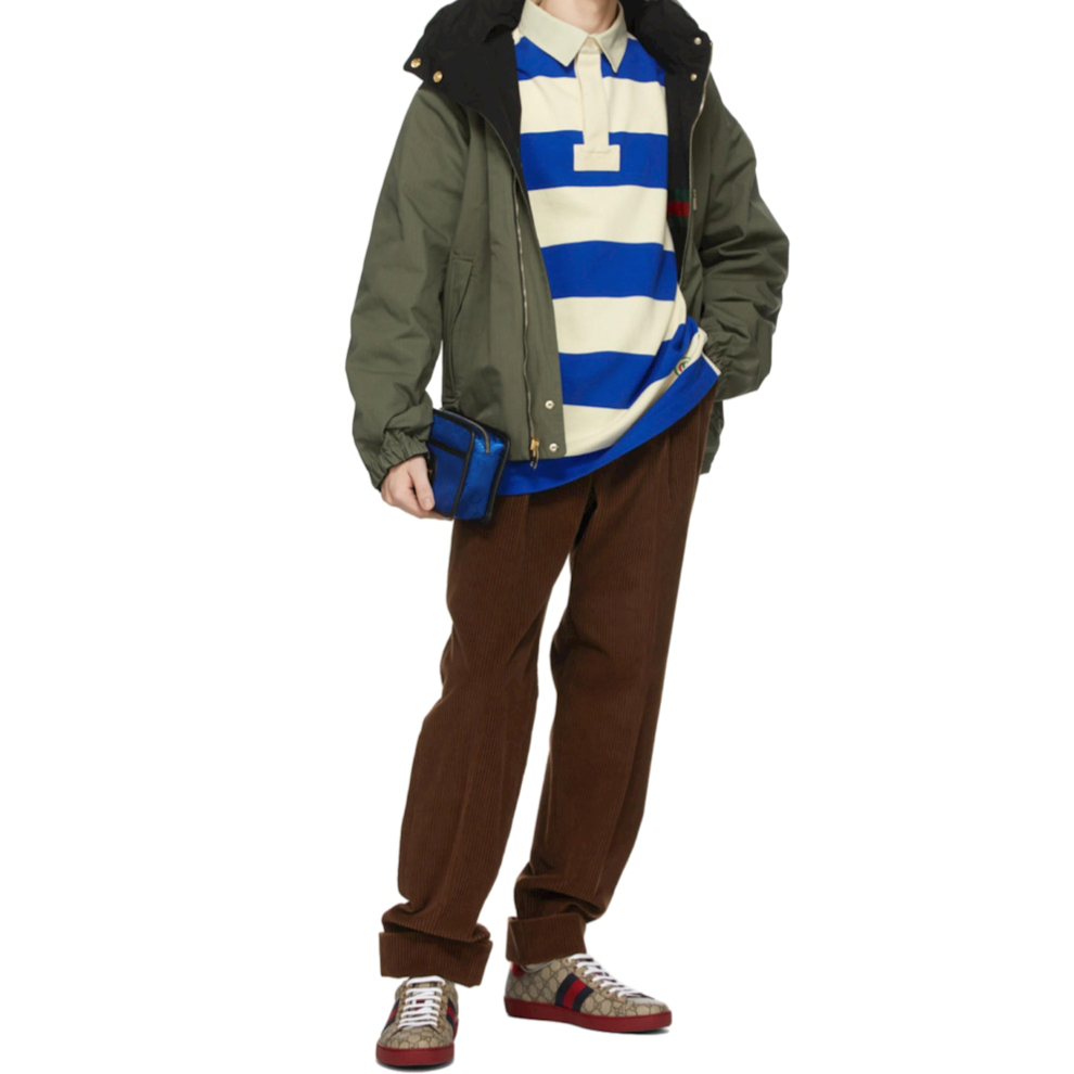 Low-top coated canvas sneakers in beige featuring logo pattern in brown. Round toe. Lace-up closure in white. Buffed leather trim in burgundy at tongue. Padded collar. Gold-tone logo stamp at mismatched red and navy metallic snake-embossed leather heel tabs. Signature webbing trim striped in red and navy at sides. Buffed leather lining in white. Treaded rubber sole in burgundy. Gold-tone hardware.