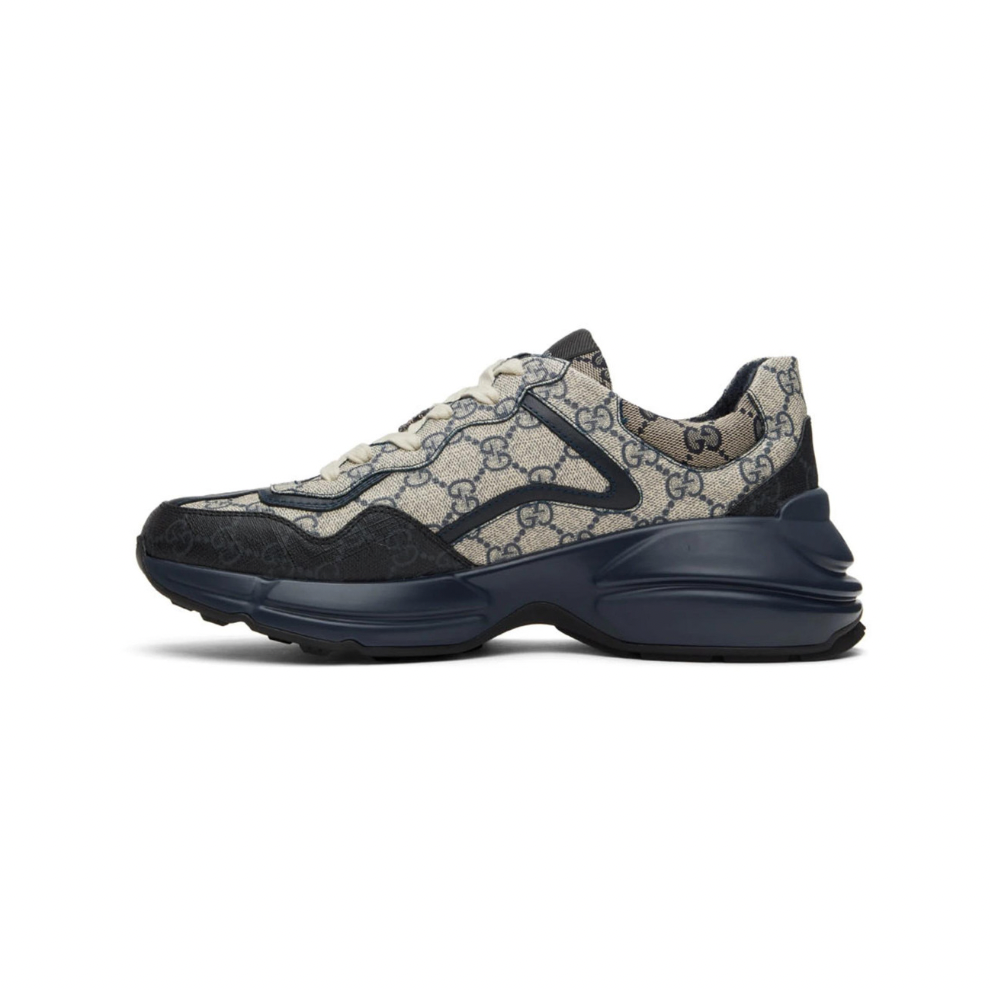 Low-top coated canvas sneakers in beige. Jacquard woven logo pattern in navy throughout.