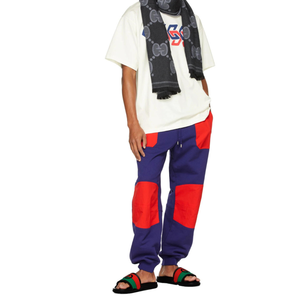 Paneled rubber slip-on sandals in black. Logo and signature stripe in red and green at rubberized vamp. Logo embossed at black textured rubber footbed. Treaded rubber outsole.