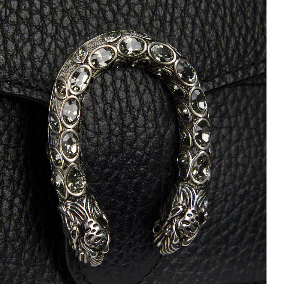 A structured leather chain super mini bag with a key ring that can be used to attach this bag to a separate larger bag. The closure has the textured tiger head spur closure-a unique detail referencing the Greek god Dionysus, who in myth is said to have crossed the river Tigris on a tiger sent to him by Zeus. The tiger head closure is enriched with Swarovski crystal stones. Made in resistant textured leather.