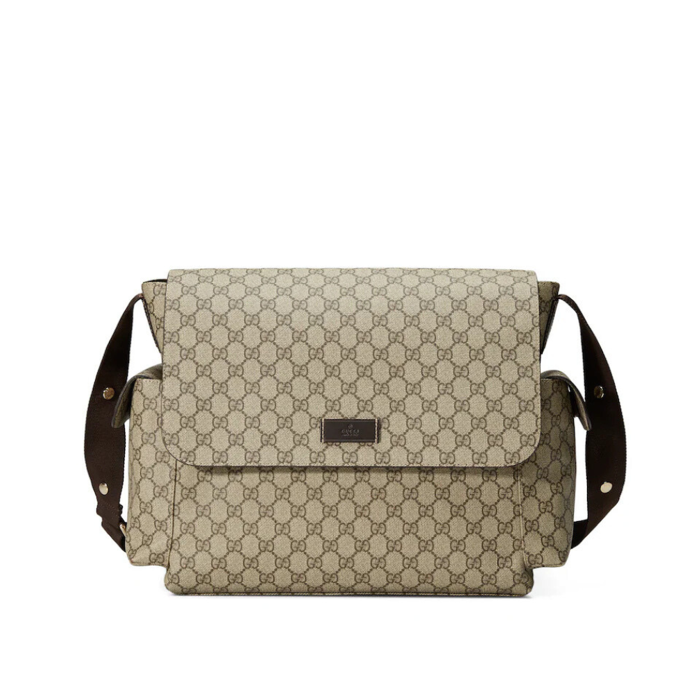 GG Supreme canvas diaper bag, designed with multiple pockets and fold-out changing mat.