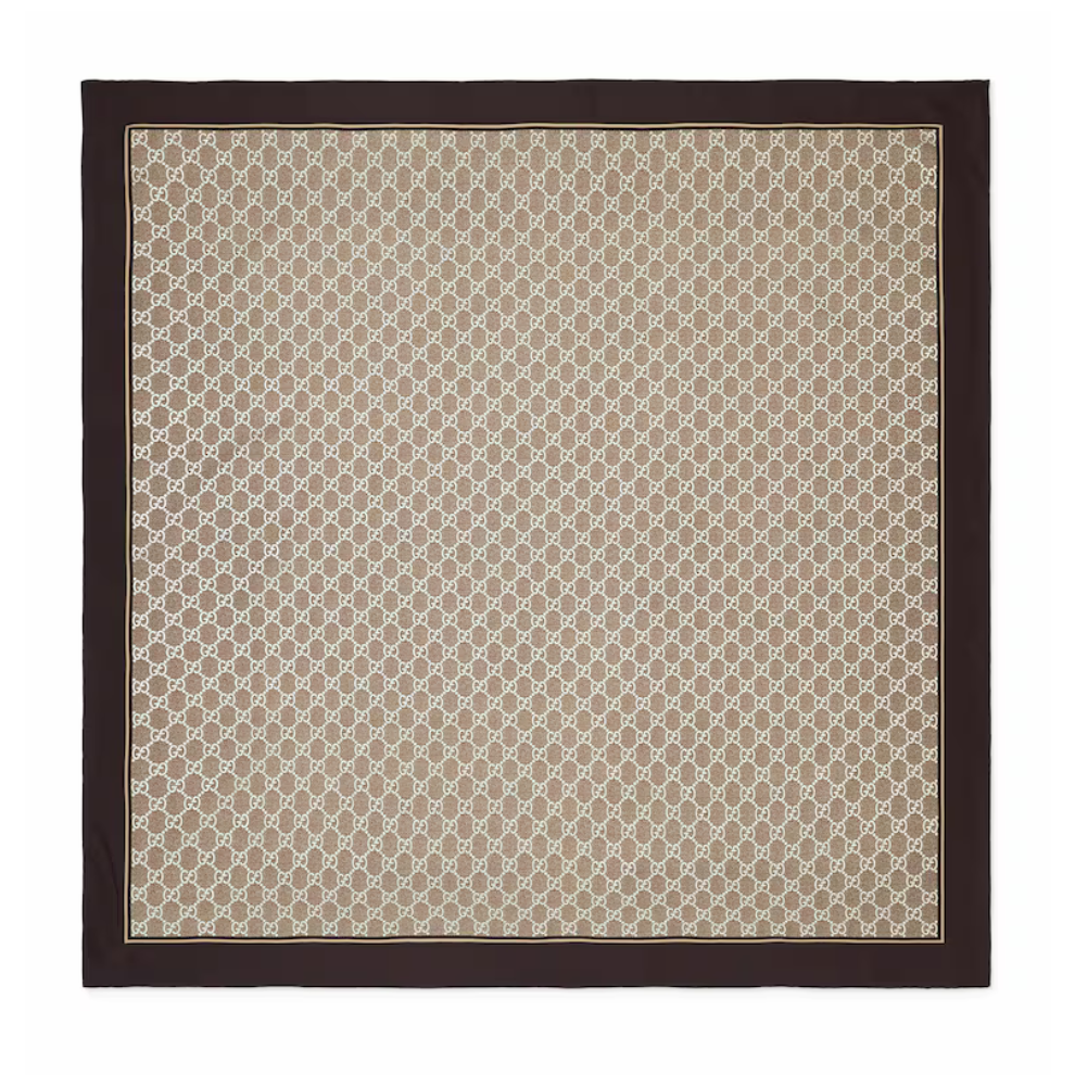 A signature symbol of the House, the GG monogram is displayed atop a selection of silk accessories in a delicate colour palette. Crafted from brown silk, this carré is defined by a laminated GG motif.