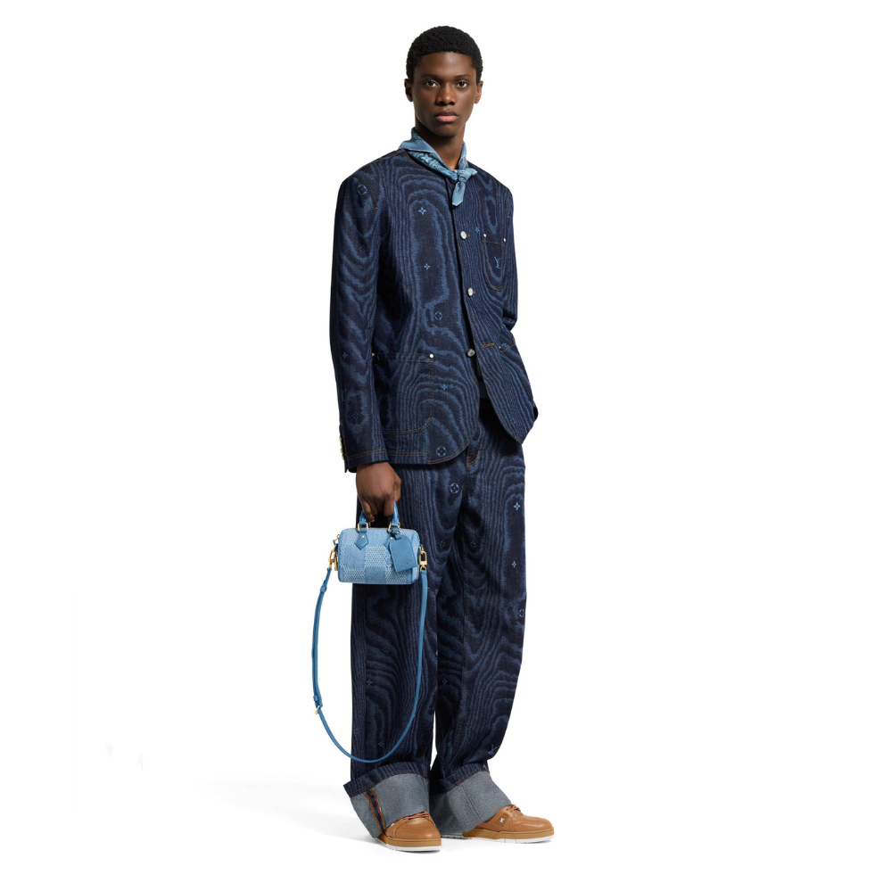 This Speedy 18 Bandoulière is made from Damier Denim 3D cotton canvas, with matching denim-blue leather trim and golden hardware. Inspired by the House’s original Damier pattern, Pharrell Williams signs the checkerboard motif with the vintage “Marque L. Vuitton Deposée” in one of the squares. The detachable and adjustable strap enables shoulder and cross-body carry.