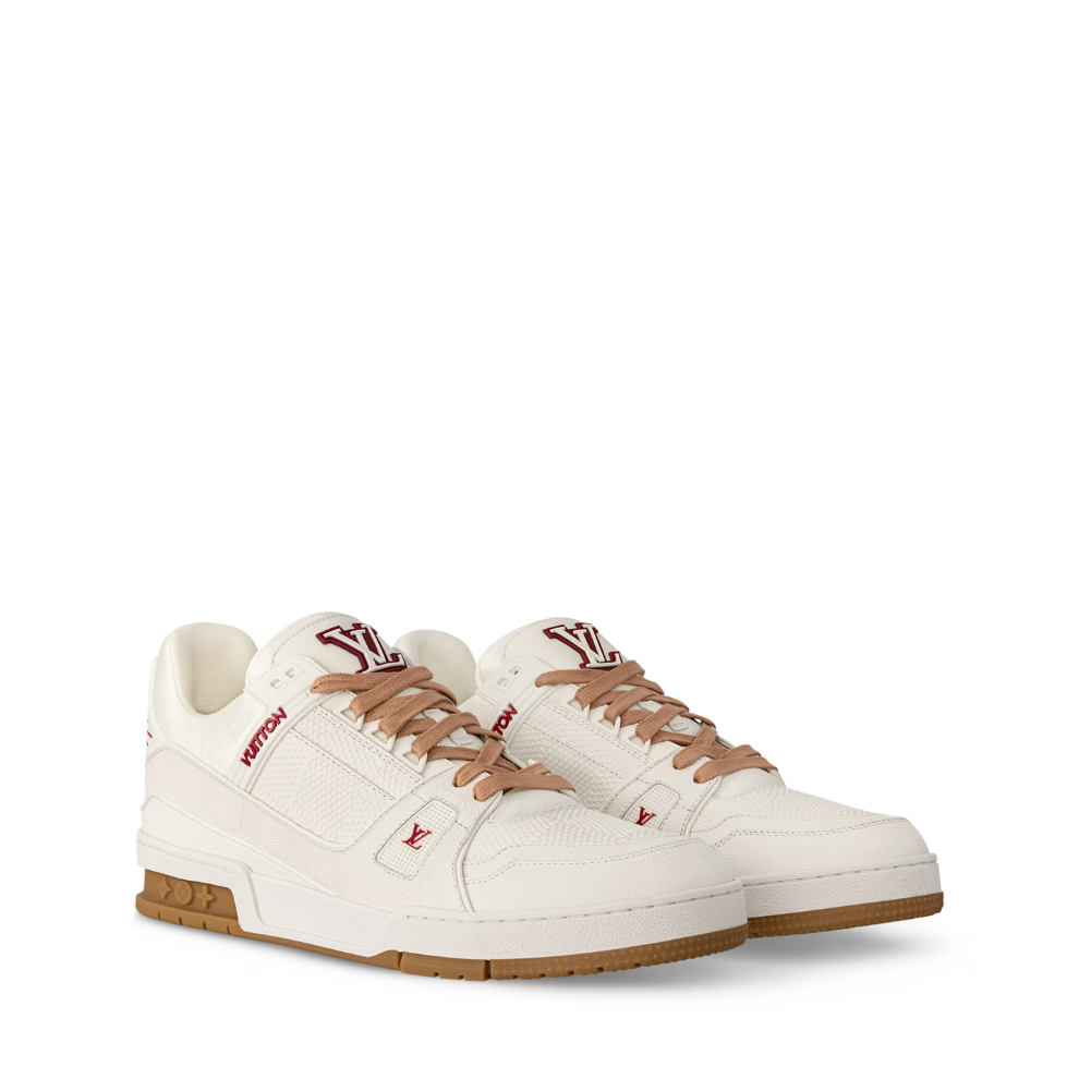 This refined iteration of the iconic LV Trainer sneaker is crafted from soft calf leather embossed with the historic Damier pattern. Leather laces with metal tips further enhance this model, which also features contrasting LV Initials and Vuitton signatures. The technical rubber outsole is decorated with three Monogram Flowers.
