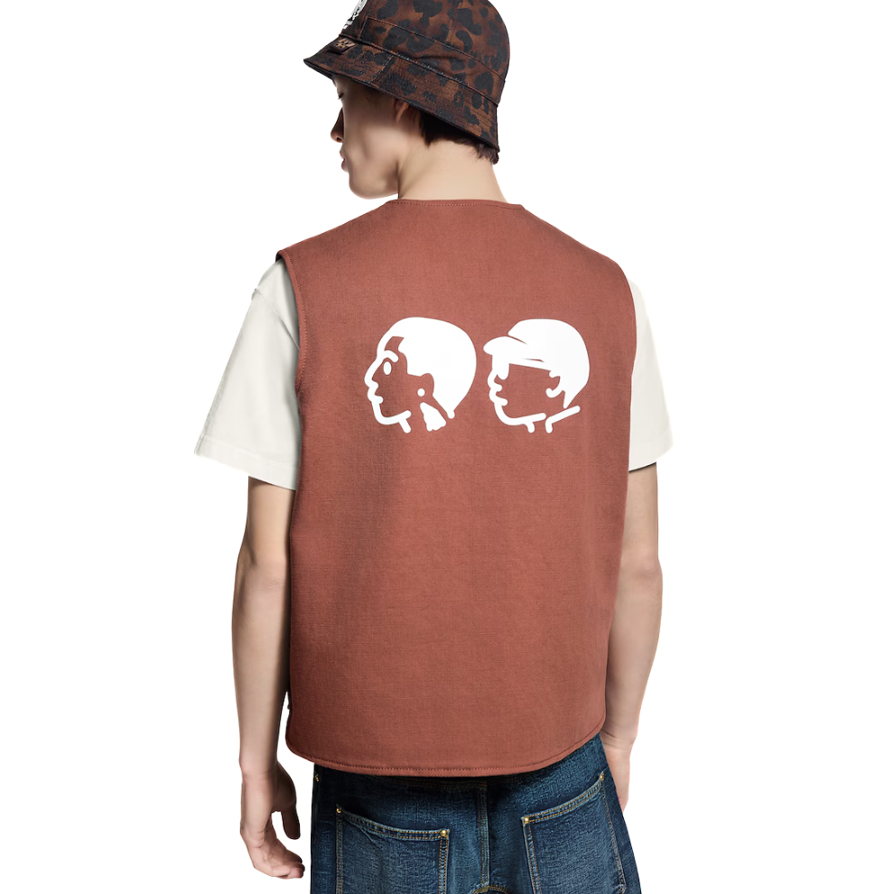 This cotton canvas zippered workwear gilet is inspired by the Pharrell and Nigo collaboration on the Fall-Winter 2025 show. It features a printed white LV PN signature above the right pocket, and graphic portraits of the designers on the back. This lightly quilted, versatile piece can be styled as an outer layer in summer or under a jacket as the days turn colder.